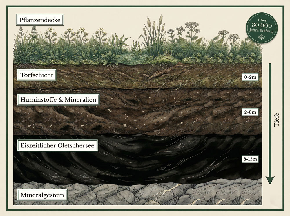 Über mehr als 30.000 Jahre haben sich Blüten, Pflanzen und Gräser in einem eiszeitlichen Gletschersee abgelagert. Dieser einmalige Reifungsprozess erzeugt ein einzigartiges Spektrum an Huminstoffen, Mineralien und Spurenelementen – wissenschaftlich untersucht von Prof. Dr. W. Ziechmann und Dr. D. Strauch.